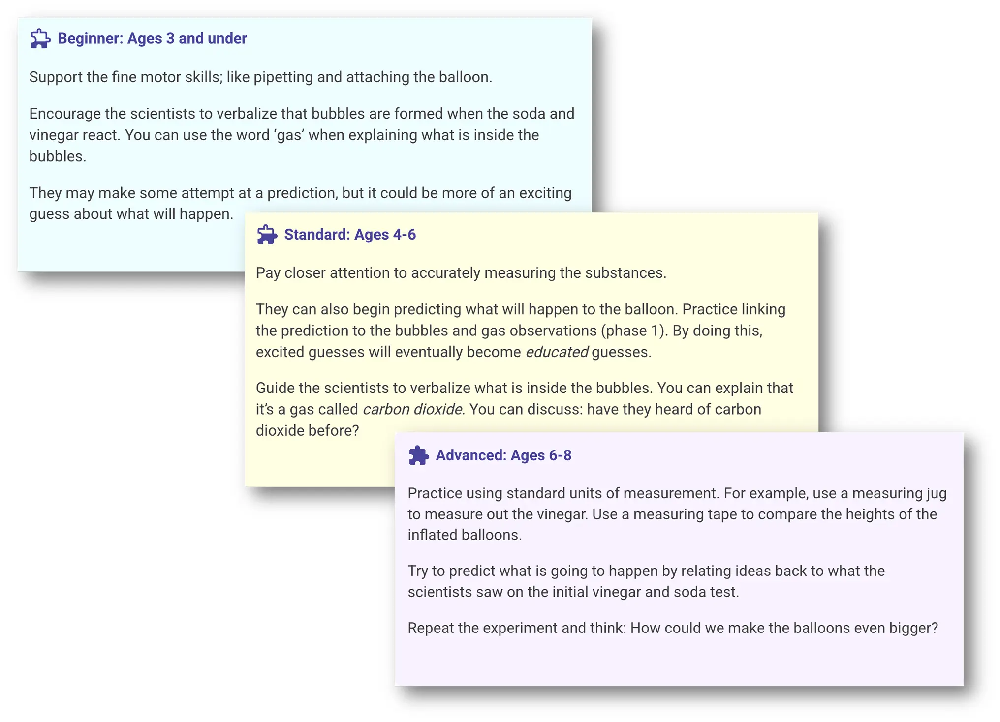 You’re right! We don’t expect you to teach the exact same lesson to every age group. Each experiment comes with adaptation tips to tailor the lesson to the age and skill levels of your group.