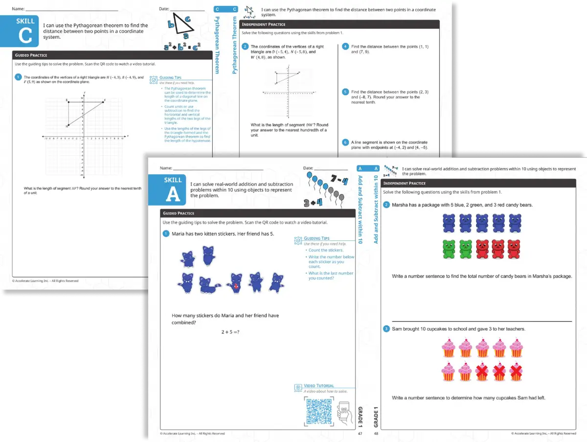Independent Skills Practice books make it easy for families to support learning at home. Each skill set includes a QR code that links to a short, step-by-step video tutorial, so parents and caregivers can quickly understand how to help with the first problem. No need to be a math expert, just scan, watch, and learn together.