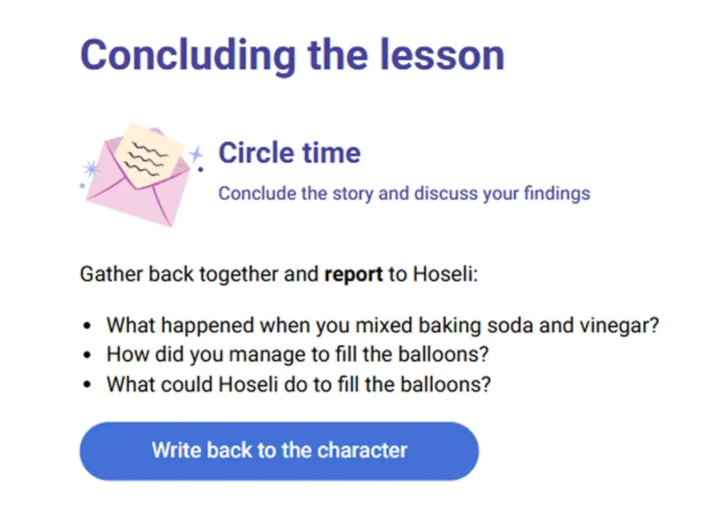 Wrap up the lesson by coming together to share your solutions with the story character. This final step reinforces early communication skills and celebrates students’ learning and problem-solving achievements.