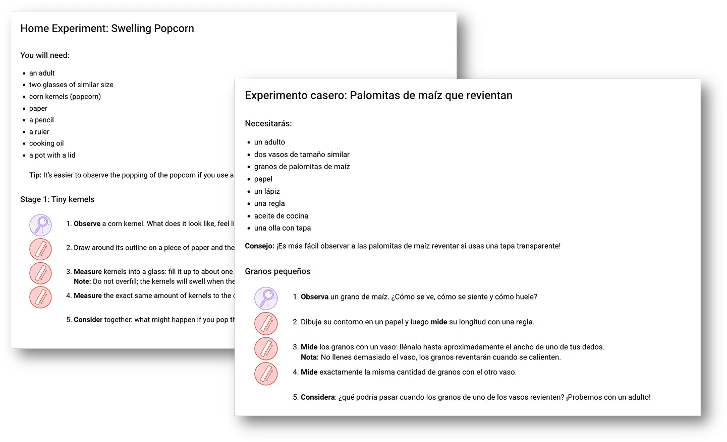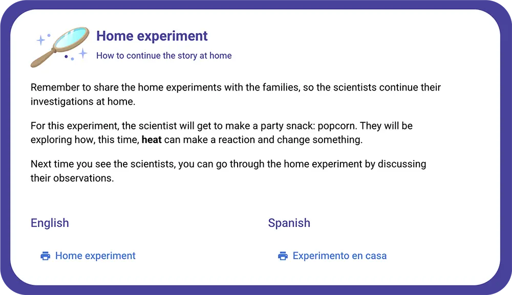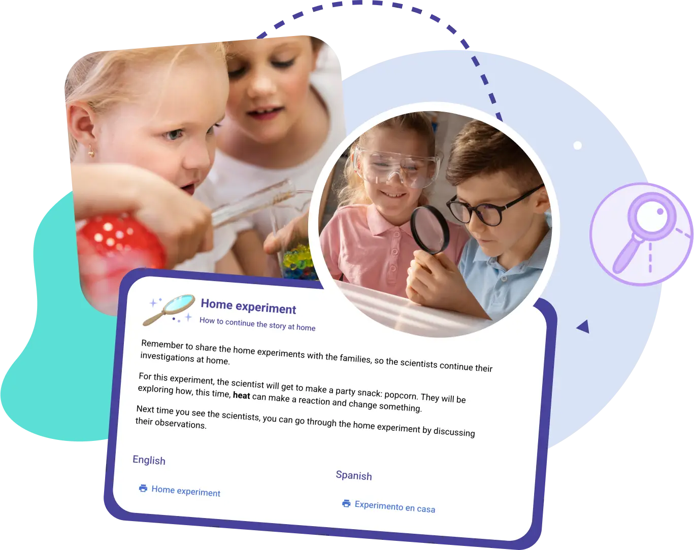 Every lesson includes a home science activities for kids, allowing young scientists to continue their discoveries beyond the classroom. Instructions are available in both English and Spanish, and students can share their observations in the next class discussion.